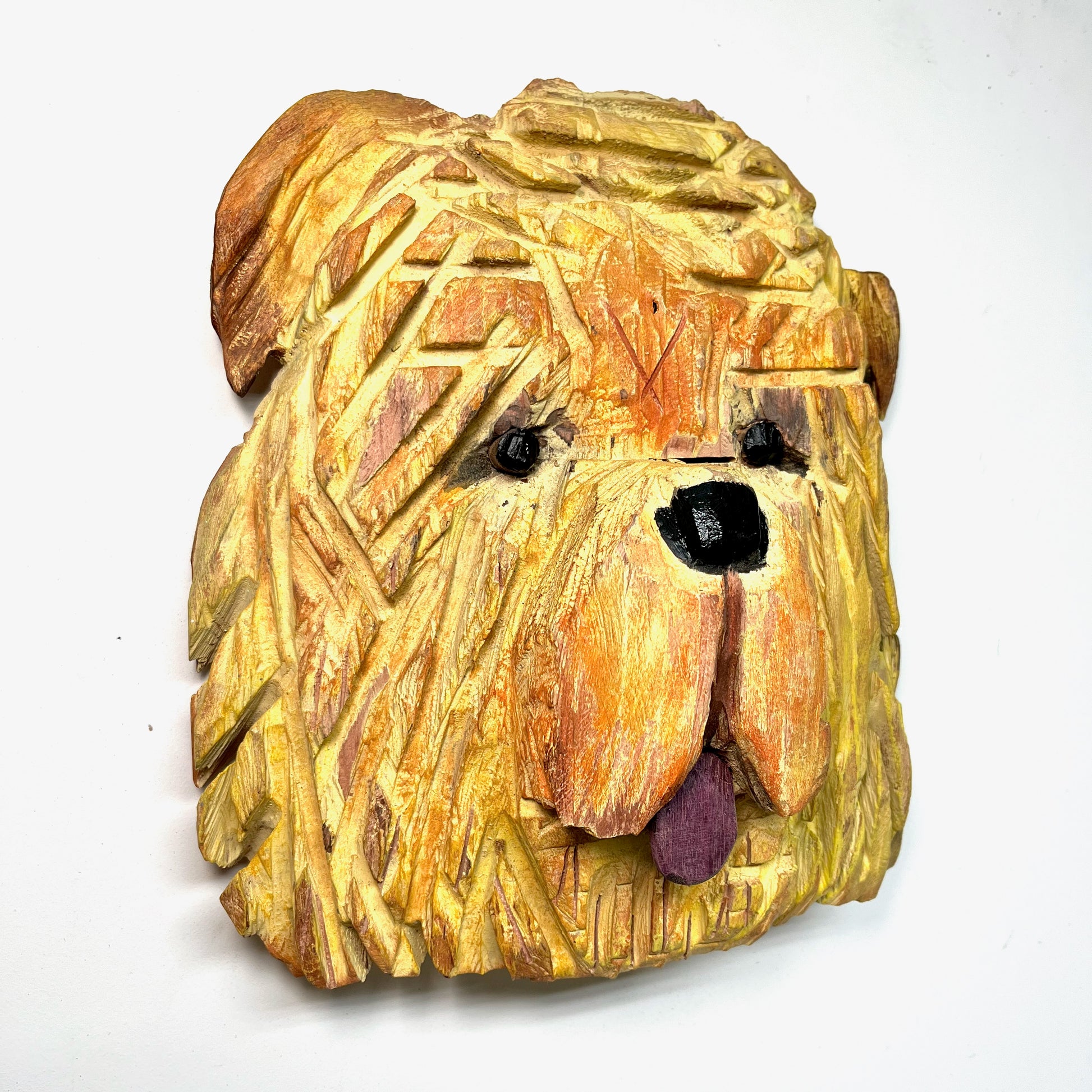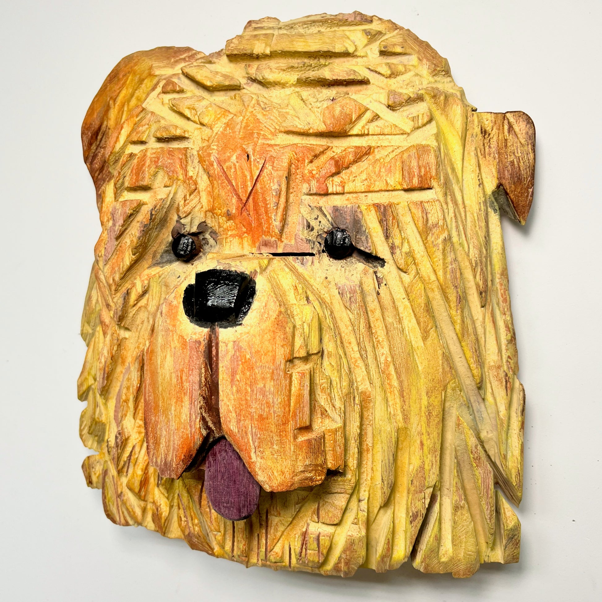 12" x 11" x 5", carved and painted redwood, purple heart